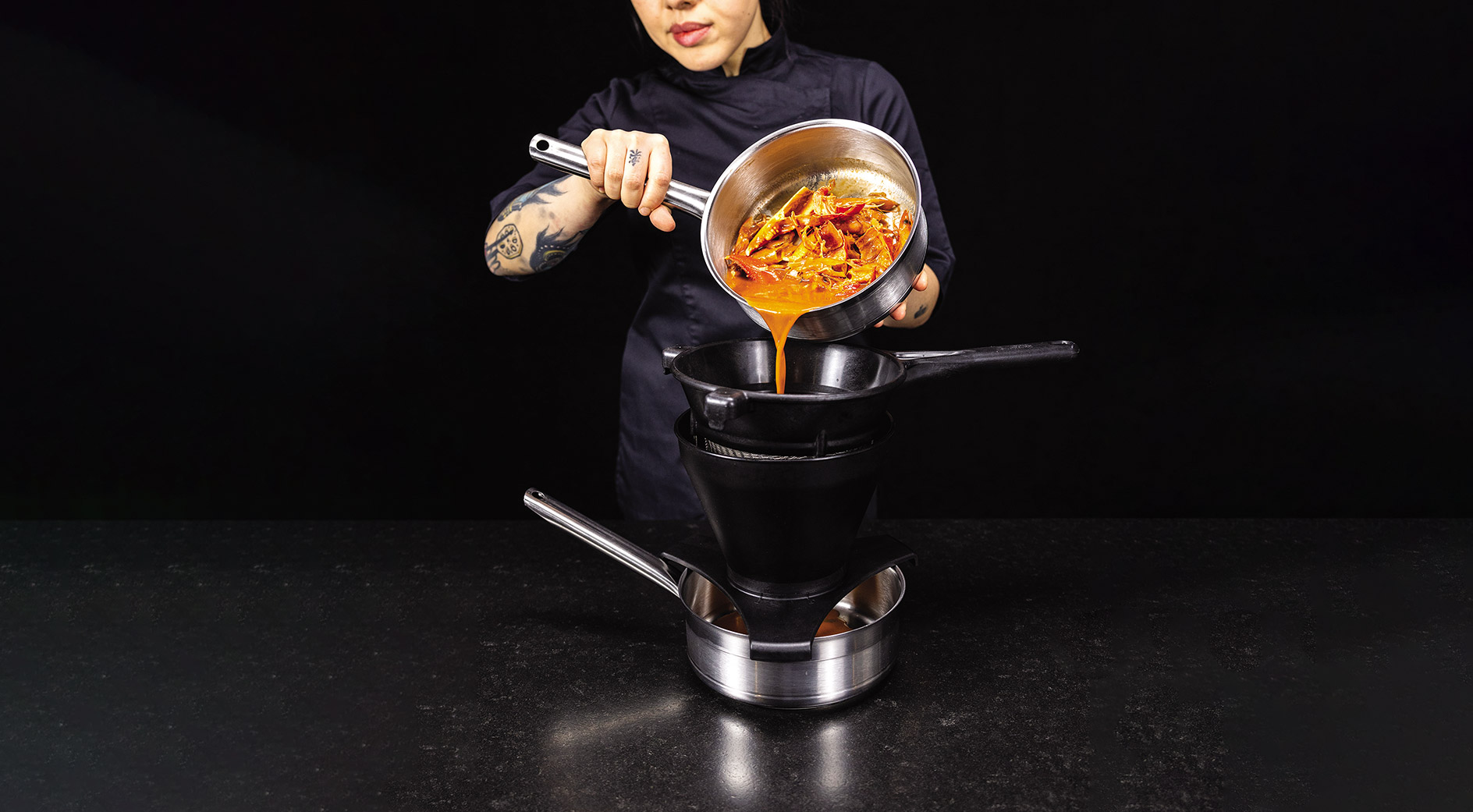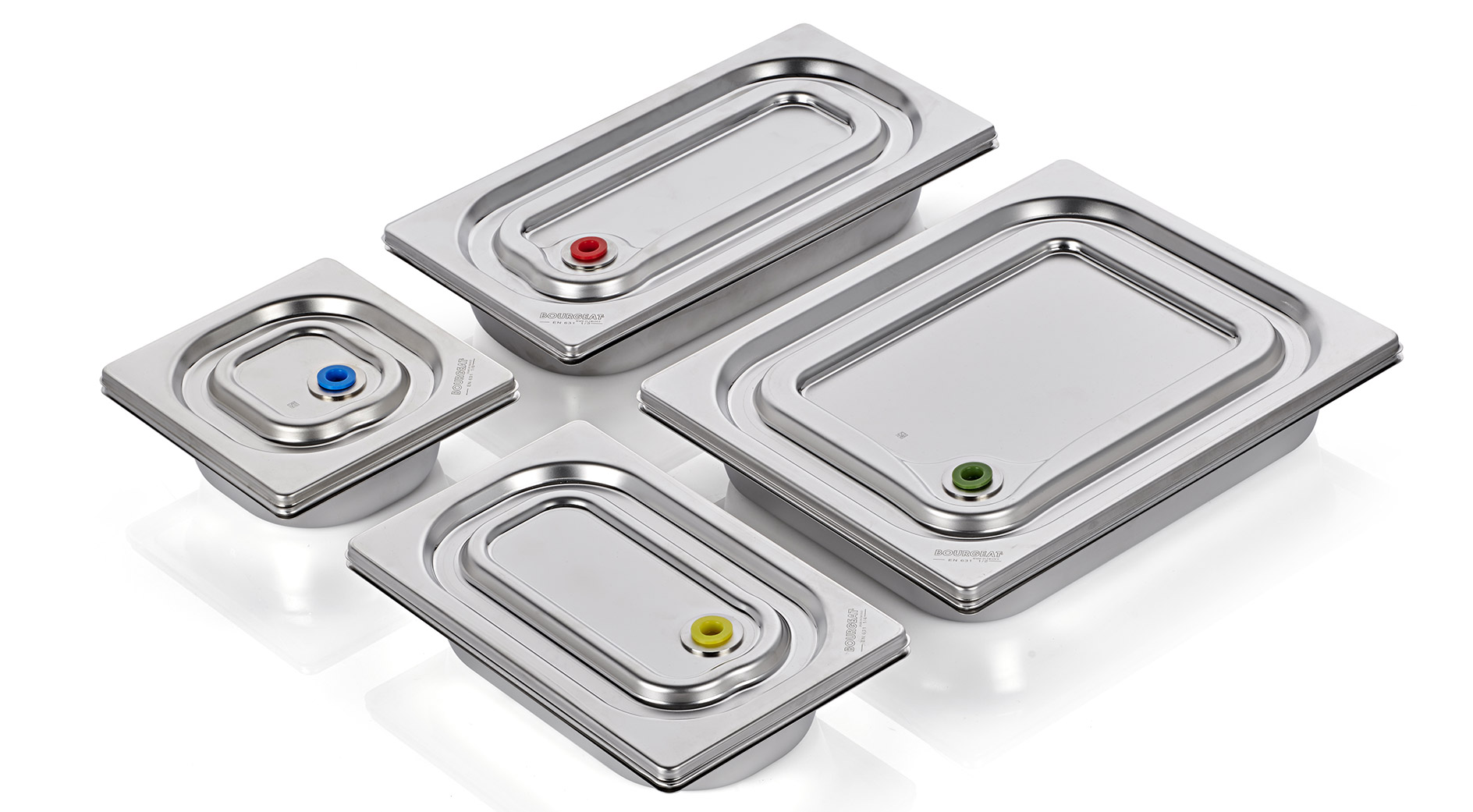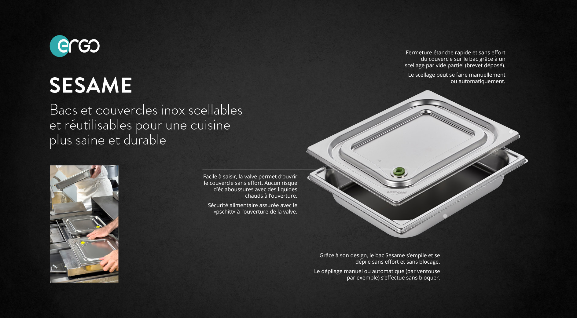 Après plus de 18 mois de recherche avec les utilisateurs, Matfer Bourgeat présente SESAME un concept de bac et couvercle en inox innovant (2 brevets européens PCT-EU), facilement scellable par tirage au vide d’air partiel, entièrement ré-utilisable pour remplacer avantageusement les contenants à usage unique en cuisine, assurer la sécurité alimentaire et répondre à toutes les exigences réglementaires. Les couvercles et bacs se ferment sans effort, manuellement ou automatiquement, et assurent une parfaite étanchéité. Compatibles avec tous types d’unités de production en liaison froide (scolaire, hospitalier…). Fonctionne avec tous les niveaux d’automatisation, en conditionnement comme au lavage. Ouverture et fermeture sans effort. Le système de vide partiel breveté préserve des efforts physiques et garantit une manipulation sûre. La valve en silicone assure l’étanchéité, le « pschitt » à l’ouverture confirme l’inviolabilité du contenant. 30 % de gain de place grâce à sa forme optimisée. Dépilage fluide, manuel ou automatique, sans coincement. Chaque élément intègre un code Datamatrix gravé dans l’inox, permet une gestion optimisée via base de données. Valves colorées pour une identification visuelle immédiate. Marquage réglementaire (DLC, numéro d’agrément...) imprimable directement sur le couvercle. Formats GN1/2, GN1/3, GN1/4, GN1/6. Épaisseur de 0,7 mm : l’équilibre idéal entre légèreté, résistance et durabilité.